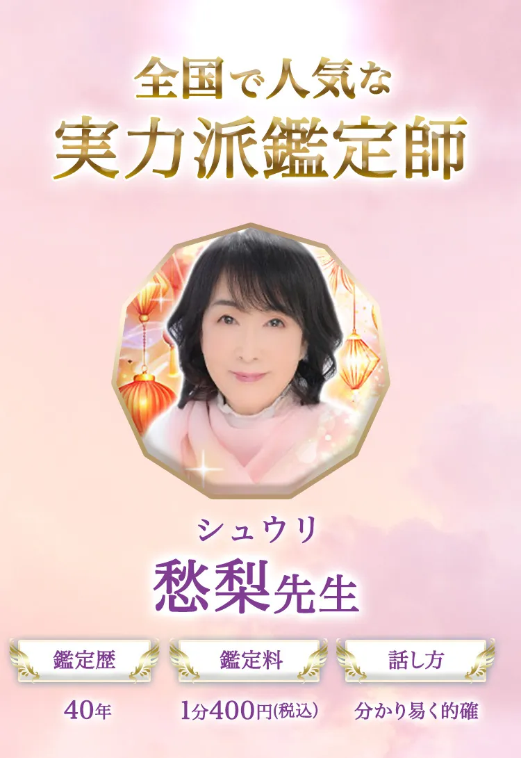電話占い業界の創業期、その誕生と共に出現し、業界初の老舗電話占い会社で長年不動のTOPに君臨。 その後も某大手電話占い会社を数社経験し、その全てでトップ鑑定師として連日予約満了の実績を誇るレジェンド鑑定師《愁梨(シュウリ)》先生がついに電話占いピュアリにて電撃デビュー!! まさに正真正銘の鑑定力を持つ者だけが成せる伝説です。 業界の関係者からも「レベルの違いがわかる」と認められ、多くの相談者からは「人生が一変した」と会社まで感謝のご連絡を頂ける程で御座います。